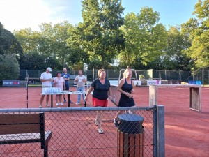 Je zou bijna vergeten dat er ook nog getennist werd. Er deden 188 mensen mee, verdeeld over 21 verschillende onderdelen. In totaal werden er 150 wedstrijden gespeeld, sommige waren erg spannend, andere iets minder. Uiteindelijk kwamen er 21 winnaars uit, die tijdens de prijsuitreiking, samen met de nummers 2, hun prijs in ontvangst mochten nemen. De winnaars van de hoogste categorieën dames en heren enkel waren dit jaar de 14-jarige Lucas Pans en de 15-jarige Julia Jellema. Zij mogen zich clubkampioen 2025 noemen. Alle winnaars van de verschillende categorieën zijn terug te vinden op https://mijnknltb.toernooi.nl.